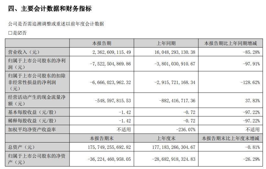 最新业绩方面,公司8月29日披露的2025年半年报显示,上半年*ST金科营业收入约23.62亿元,同比减少85.28%;归母净利润约-75.23亿元,同比/span>;扣非净利润约-66.66亿元,同比减少128.62%;经营活动产生的现金流量净额约-5.486亿元。